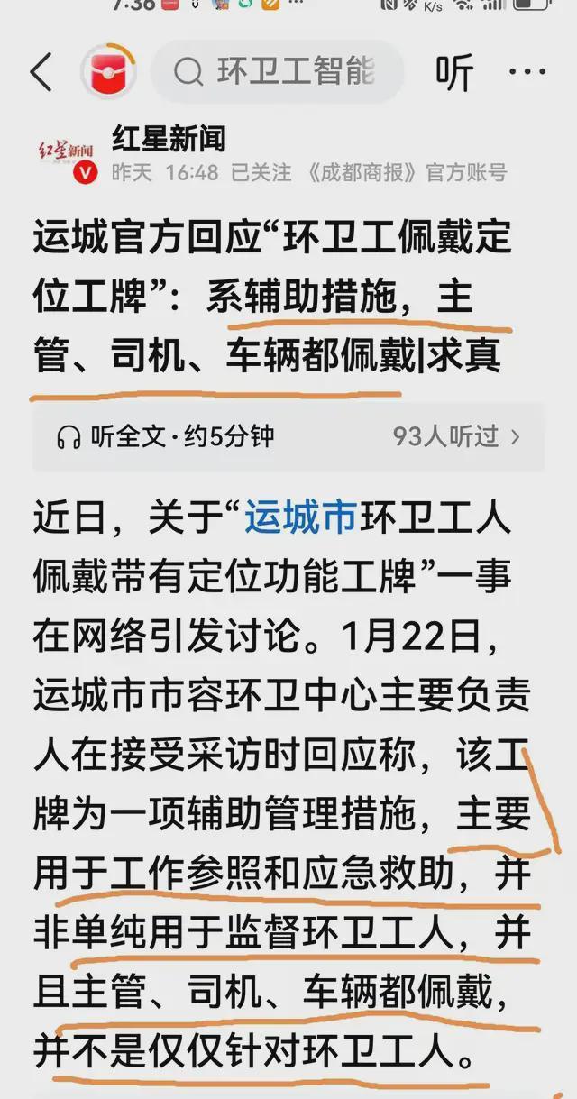 运城市市容环卫中心主要负责人接受采访时说:该工牌为一项辅助管理措施,主要用于工作参照和应急救助,并非单纯用于监督环卫工人,并且主管、司机、车辆都佩戴,并不是仅仅针对环卫工人。